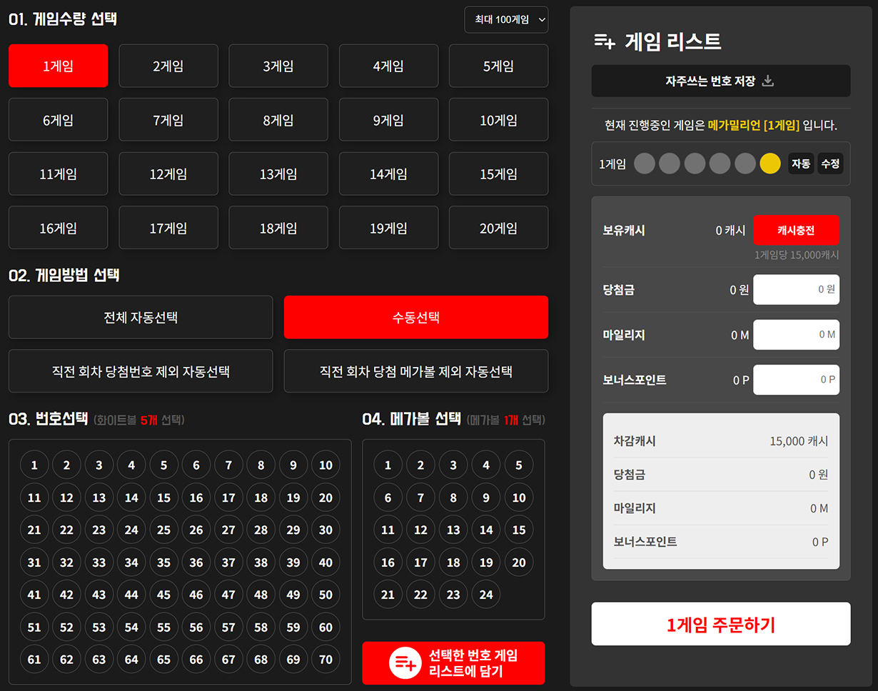 - 2. 1 부터 24까지의 숫자 중 메가볼 1개를 선택하여 총 6개의 번호를 선택합니다.
