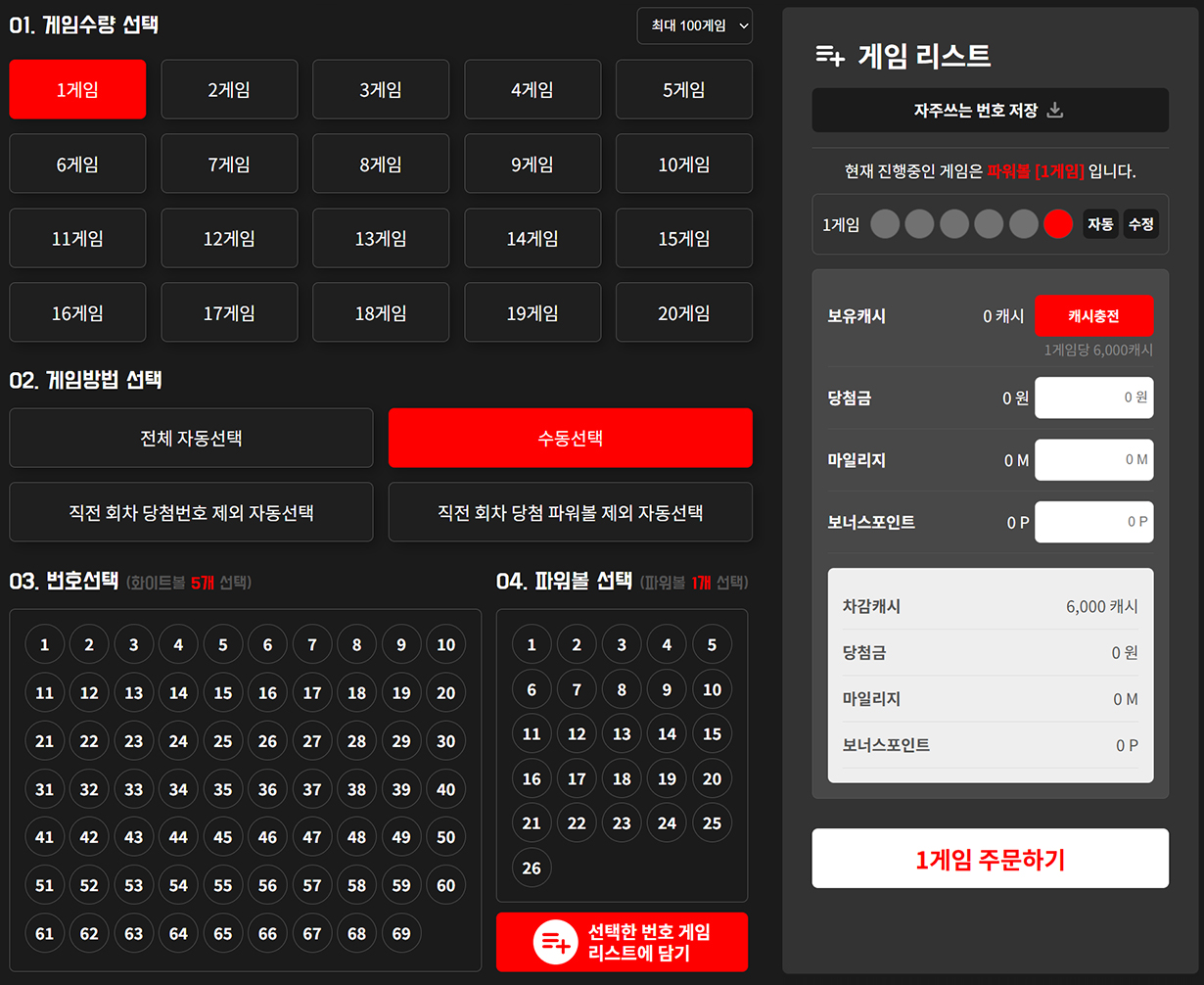 1. 1. 1 부터 69까지의 숫자 중 화이트볼 5개를 선택 합니다.