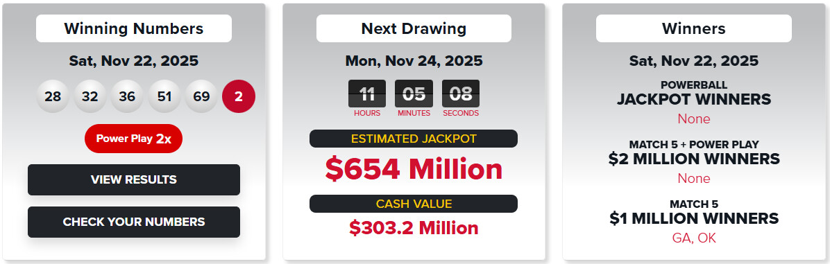 CA주 복권국에 따르면 지난 22일 추첨에서 28, 32, 36, 51, 69 파워볼 넘버 2번 등 여섯 자리 숫자를 모두 맞춘 행운의 주인공은 나오지 않았다.